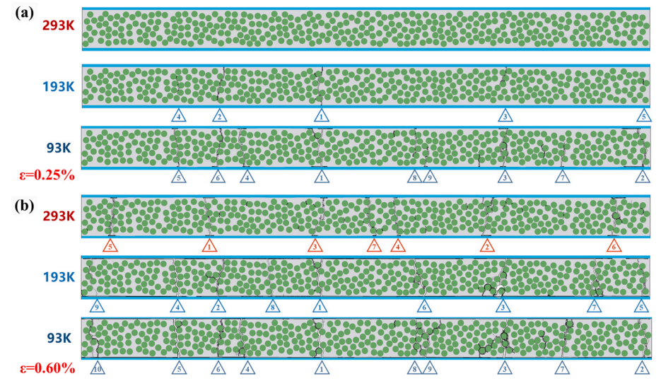 该研究首次开展了复合材料层板的超低温原位μCT表征,结合多尺度计算分析方法研究了超低温环境下树脂基复合材料层板内部的损伤演化行为及影响机制。研究首先基于超低温原位微焦点CT表征系统,在293K、193K、93K等典型温度下开展了层板拉伸过程的原位表征,如图1所示。基于层板内部微结构形态特征,损伤类型被划分为90°铺层基体裂纹、-45°铺层基体裂纹和分层损伤。原位表征结果(图2)表明,超低温环境下层合板的损伤行为加剧,90°铺层基体裂纹和分层损伤的体积分数显著增加,且拉伸过程中初始损伤提前萌发。层板的损伤形貌表明,室温与低温环境下的分层损伤均由90°铺层基体裂纹扩展生成,而超低温环境下由于热应力的产生,加速了裂纹扩展过程。