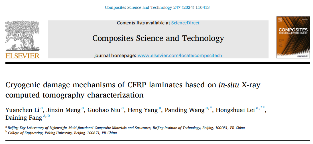 近日,我院雷红帅教授、王潘丁副教授等人在方岱宁院士的指导下开展了基于低温原位μCT表征技术的复合材料低温失效机理研究,明晰了超低温环境下复合材料层板内部的损伤演化特征及影响机制。研究成果以“Cryogenic damage mechanisms of CFRP laminates based on in-situ X-ray computed tomography characterization”为题发表于复合材料力学领域顶级期刊《Composites Science and Technology》(IF=9.1, https://doi.org/10.1016/j.compscitech.2023.110413)。