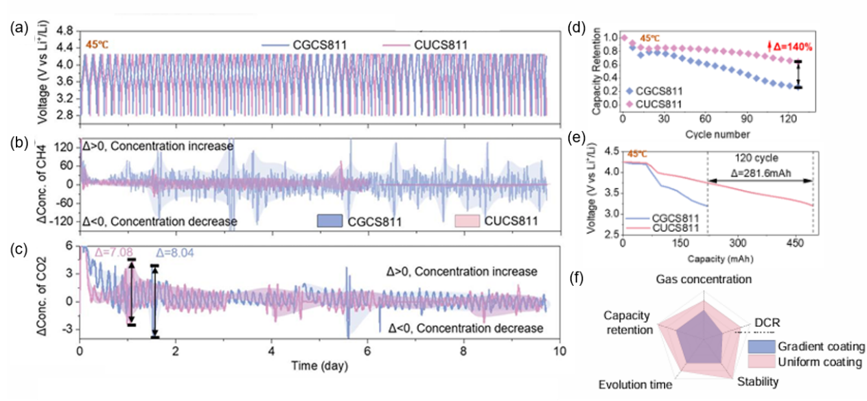 图 3 45℃快速老化循环过程中服役稳定性。(a)两体系电池充放电曲线;(b)120周循环CH4及(c)CO2演化速率曲线;(d)CGCS811和CUCS811电池在120个循环中的容量保持;(e)第120圈容量和电压曲线;(f) )CGCS811和CUCS811正极对比。