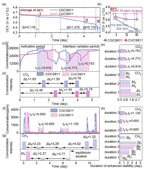 图 4 65℃快速老化的电池热稳定性。(a)两体系电池开路电压曲线;(b)快老化存储过程中明显压降持续时间(I、II、III)的电压对比。(c-f)各电池的CO2和CH4浓度及最大气体浓度的演化时间间隔(d和g)。(e,h)两个电池之间最大CO2和CH4浓度的演化时间间隔。