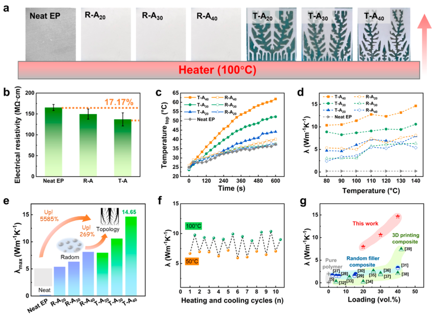 研究获得的仿叶脉Al2O3/EP复合结构的热导率高达14.65 W/m·K,较填料型复合材料提高269%、纯聚合物提高5585%,且具有良好的冷却循环性能、绝缘性和良好的散热性能。