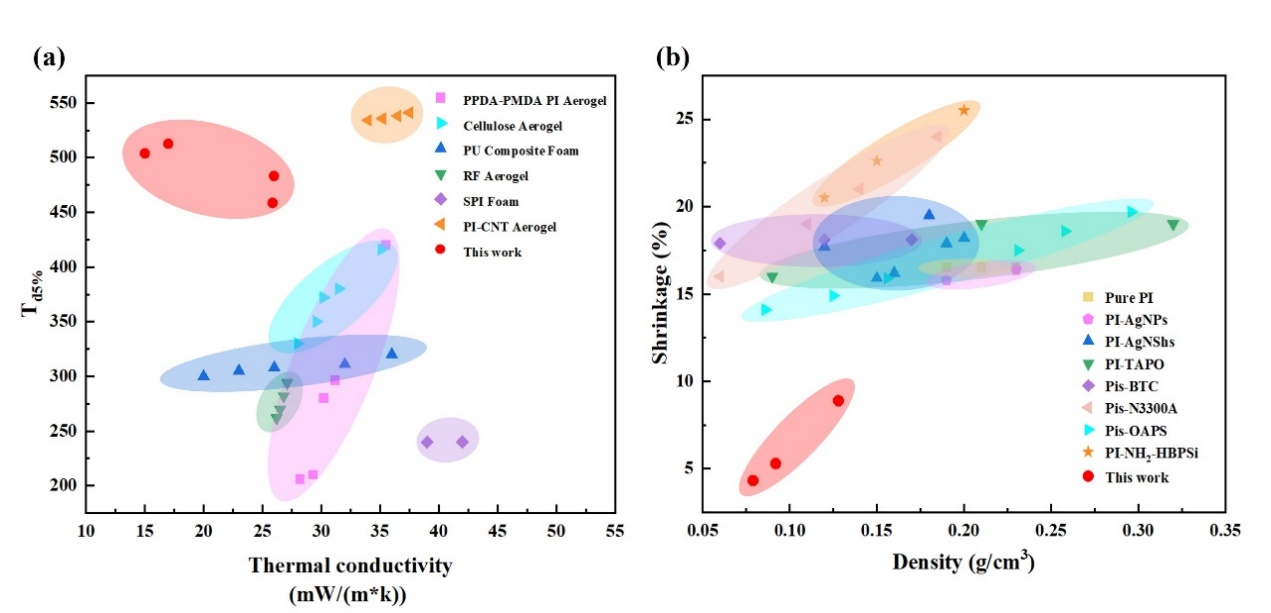 图8. 制备的PIAs的综合性能:(a)制备的PIAs与先前报道的气凝胶和泡沫的导热性和耐温性的比较;