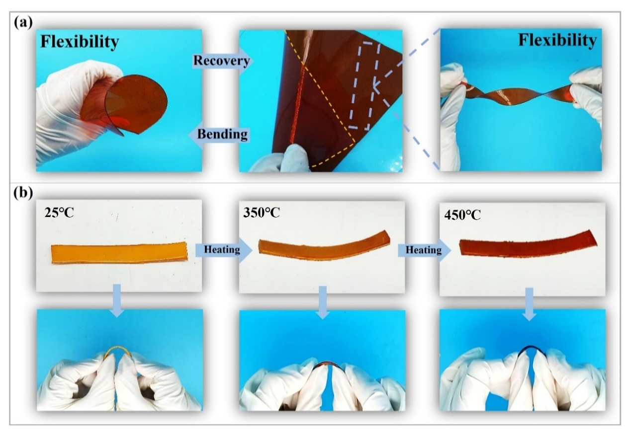 (b) P1B1-PIA薄膜的耐温性测试及高温处理后样品的柔韧性表征。