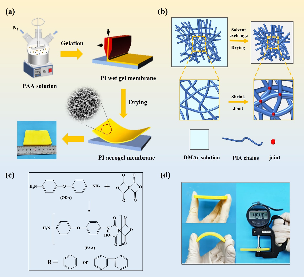 图1. PIA的合成方案、分子结构及物理图像:(a) PIA制备示意图;(b) PIA合成过程中的分子链组装示意图;(c)芳香二胺与芳香二酐的反应;(d)厚度为4.546毫米的P0B1-PIA图片。