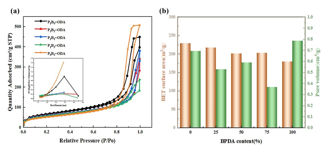 图6. PIAs的BET测试结果:(a)不同二酐单体比例制备的PIAs的孔径分布和比表面积;