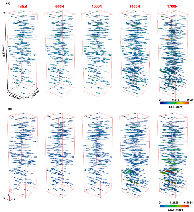 图1. 裂纹张开位移及张开面积随加载过程的变化