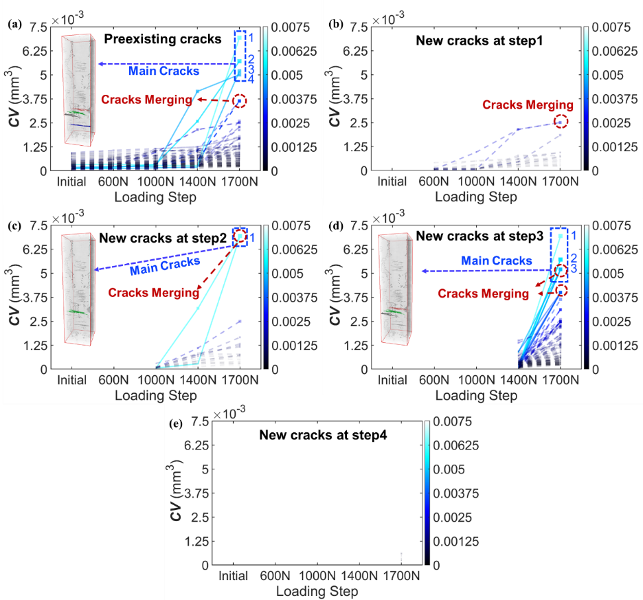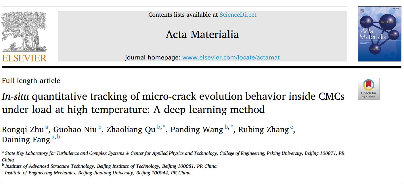 近期,我院曲兆亮、王潘丁副教授在方岱宁院士的指导下,针对于陶瓷基复合材料提出了一种基于生成对抗神经网络的高精度微裂纹量化提取追踪方法,并基于该方法实现了热力耦合加载条件下陶瓷基复合材料微裂纹演化行为的量化追踪,提取并分析了包括裂纹体积、裂纹张开面积,裂纹张开位移等关键裂纹参量的演化过程,以及裂纹网络扩展与主裂纹的形成机制。该研究成果以“In-situ quantitative tracking of micro-crack evolution behavior inside CMCs under load at high temperature: A deep learning method”为题发表于期刊《Acta Materialia》。