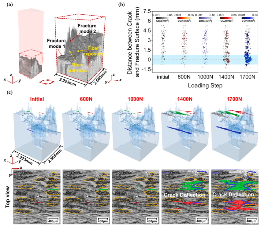 图3. 断裂失效分析:(a)断面形貌,(b)不同加载步下微裂纹与断面距离,(c)主裂纹分布与断面的位置