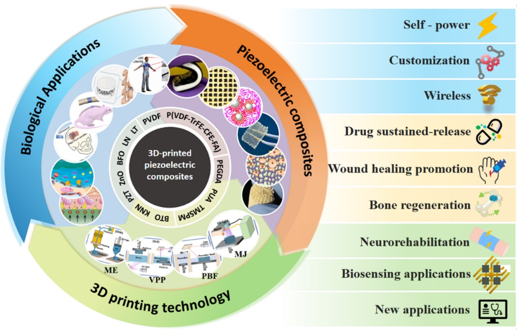 在军事行动、体育活动以及交通出行等多种场合中,人们常常会面临各种伤害的风险,这些伤害可能涉及出血、骨折等多种类型,对个人的身体健康造成显著影响。“面向人民生命健康,”急需发展更加高效的医用材料。压电复合材料(piezoelectric composites)因其将机械力转换为电信号的能力,在生物医学领域受到了广泛关注。通过3D打印技术制备具有复杂结构的压电复合材料,不仅可以有效提升其压电输出性能,还能实现定制化的治疗应用,具有重要临床前景。