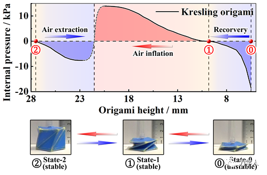 在具体的研究过程中,研究团队首先对Kresling折纸气囊的双稳态条件进行了详细分析。通过机构运动学的研究,得到Kresling折纸结构参数与稳态数量的对应关系,设计并制备了折纸气囊驱动装置,并通过有限元仿真和气动实验进行验证。图2展示了在气动实验中,Kresling折纸气囊内部气压与结构高度之间的对应关系。结果表明:当内压降至-7.6kPa时(对应结构高度22.5mm),折纸气囊由展开状态切换为折叠状态;当内压增至14kPa时(对应结构高度20.5mm),折纸结构由折叠状态切换为展开状态。