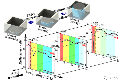 综上,研究人员在方岱宁院士先进结构技术新思想的启发下,创新提出了一种仿变色龙可调控宽频电磁吸波隐身超结构的设计方法,通过调整Kresling折纸气囊内压强度切换结构稳态,实现高低频互补的吸波效果切换,显著拓展吸波频带,为可调电磁吸波结构设计提供了新思路。
