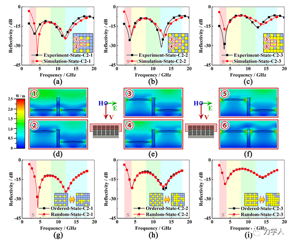 研究团队还对格栅结构的电磁吸波机理进行了分析(见图4),结果显示:在电磁性能调控过程中,圆形电阻片主要与阻抗型格栅内壁面电阻相互作用产生共振,吸收电磁波能量,且胞元间的电磁特性相互独立。研究团队进一步引入数字化调控策略进行各胞元状态的精准控制,实现电磁吸波效果的连续变化,发现电磁性能仅与处于不同状态下胞元的比例相关,与排布方式无关,结构电磁性能具有良好的鲁棒性,部分胞元失效对结构的整体性能影响较小。