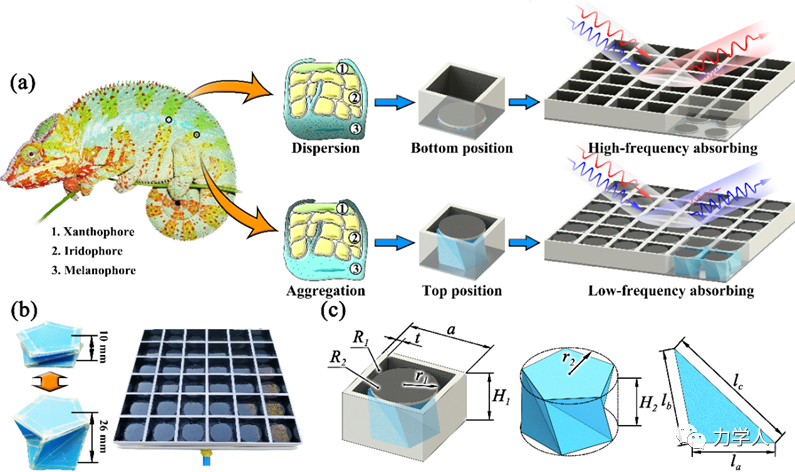 变色龙是自然界中可实现体表颜色快速变化的最具代表性的生物之一,其表皮的颜色变化源自于虹色素细胞和载黑素细胞的相互作用。其中,虹色素细胞提供底色,而载黑素细胞通过控制内部的黑色素在底部储囊和顶部分支之间快速移动实现体色的明暗转变,见图1所示。受此启发,研究团队通过模拟变色龙两种表皮细胞的不同功能,开发了一种可调控超宽频电磁吸波结构。选取了阻抗型格栅作为主体结构,模拟虹色素细胞的功能;选用圆形电阻片置于格栅中组成阵列,达到频率选择表面的效果,模拟载黑素细胞的功能;引入了具有双稳态特性的Kresling折纸结构作为驱动气囊,极大地简化了驱动装置的复杂程度,并可在电磁性能调控过程中可实现稳定可靠的结构自支撑。当电阻片位于底部和顶部的不同位置时,吸波结构分别实现高频宽带和低频深带的隐身效果。通过优化充分发挥二者的吸波性能,最终实现高低频互补的全频段电磁隐身。