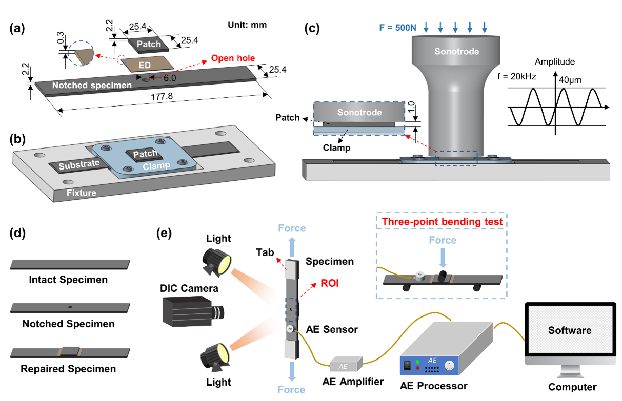 本研究采用五缎纹编织CF/PPS复合材料,通过控制不同焊接时间(1s-2s)对损伤结构进行焊接修复。采用单轴拉伸和三点弯力学测试,结合数字图像相关(DIC)和声发射(AE)技术进行损伤演化监测。此外,构建了有限元模型以验证损伤修补样件的力学行为和应力分布。