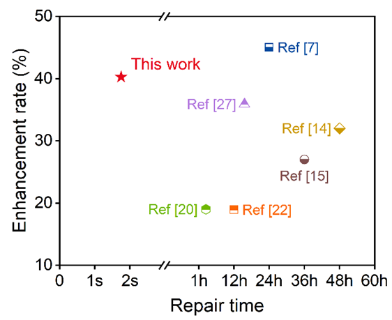 图4. 本研究与文献中拉伸强度增强率和修复时间的比较(文献中胶粘修复时间是基于所用胶粘剂的固化时间计算的)