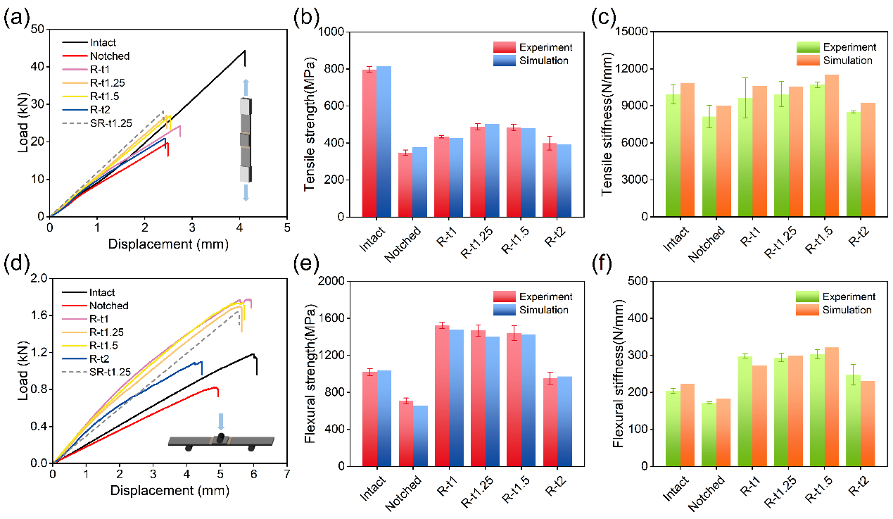 图2.拉伸和三点弯测试载荷-位移曲线、强度和刚度实验与仿真对比图
