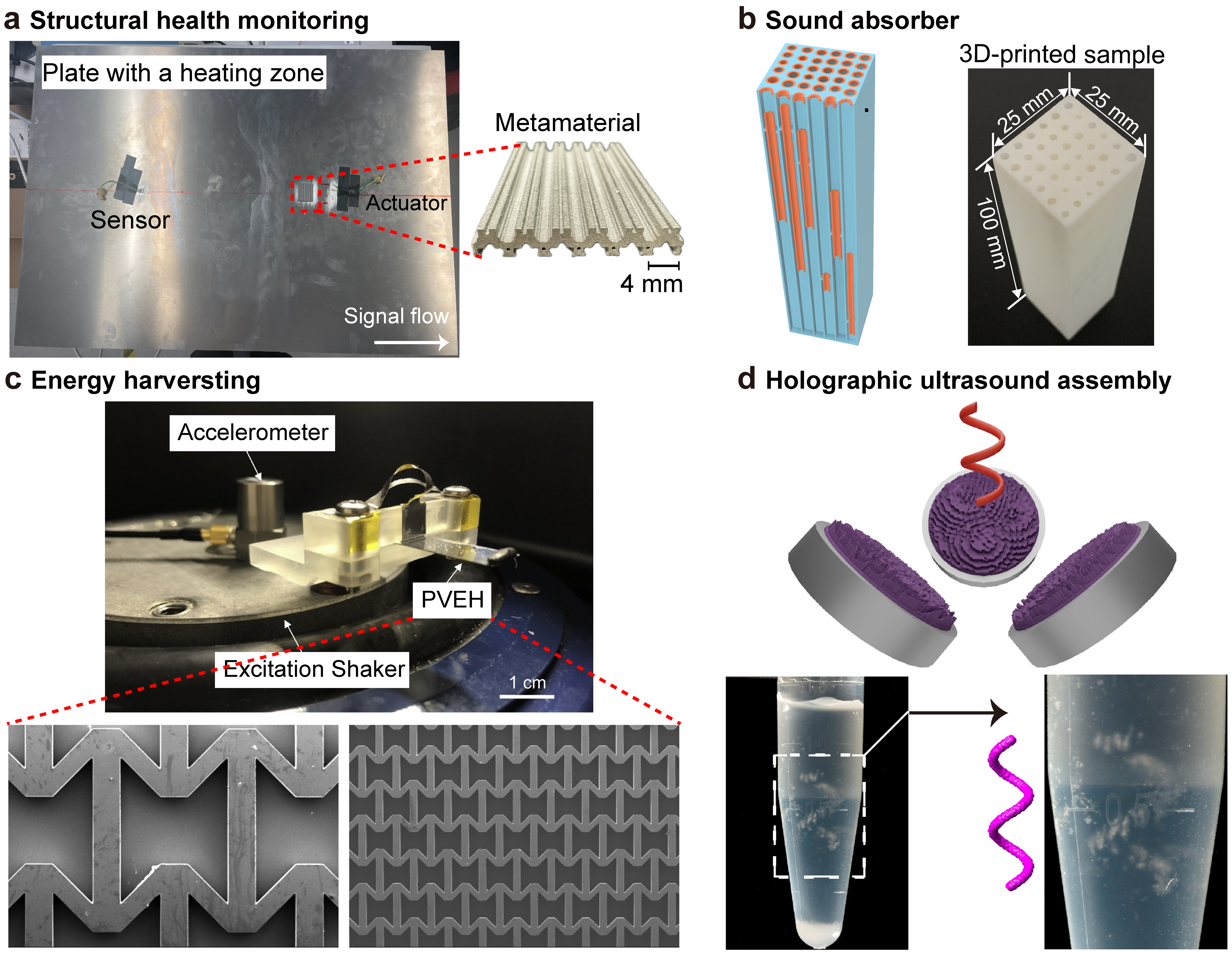 如图2所示,文章从逆向设计所用的基本波动参量(频散关系、散射表征参量、动态等效参数)出发,系统地介绍了基于拓扑优化、机器学习的逆向设计方法。其中,拓扑优化方法又包含了基于全波响应、本征物理参量、混合局部-全局响应的优化等三个方面。针对基于机器学习的逆向设计,又从数据驱动和物理信息两个角度进行了详细阐述。最后,也介绍了若干典型的半经验式优化策略。针对逆向设计的声子晶体与声子拓扑绝缘体,文章从带隙工程、滤波和聚焦、拓扑波动传输三个方面,详细地介绍了逆向设计的声子晶体、声光子晶体、声子晶体器件、弹性波拓扑绝缘体、声波拓扑绝缘体等。针对逆向设计的声子超材料,文章从负等效性质、低损耗隐身、低频抑振/声、极端模式驱动的波传播四个方面详细介绍了如何逆向设计各类声子超材料,以及相关领域取得了哪些波动特性/功能的突破和新机制的发现。针对逆向设计的声子超表面,文章从异常反射与吸收、透射波束与声辐射力、多功能散射三个方面进行了详细介绍。在对各类声子超构材料逆向设计(图3)系统总结的基础上,文章进一步回顾了几类定制化的声子超构材料,结合具体的逆向设计策略,专门介绍了基于非线性滤波效应的结构健康监测、基于超宽带阻抗调制的低频宽带低回声吸音器、基于弹性超材料的振动能量俘获装置、以及基于声学超表面的全息超声微粒组装等代表性应用(图4)。