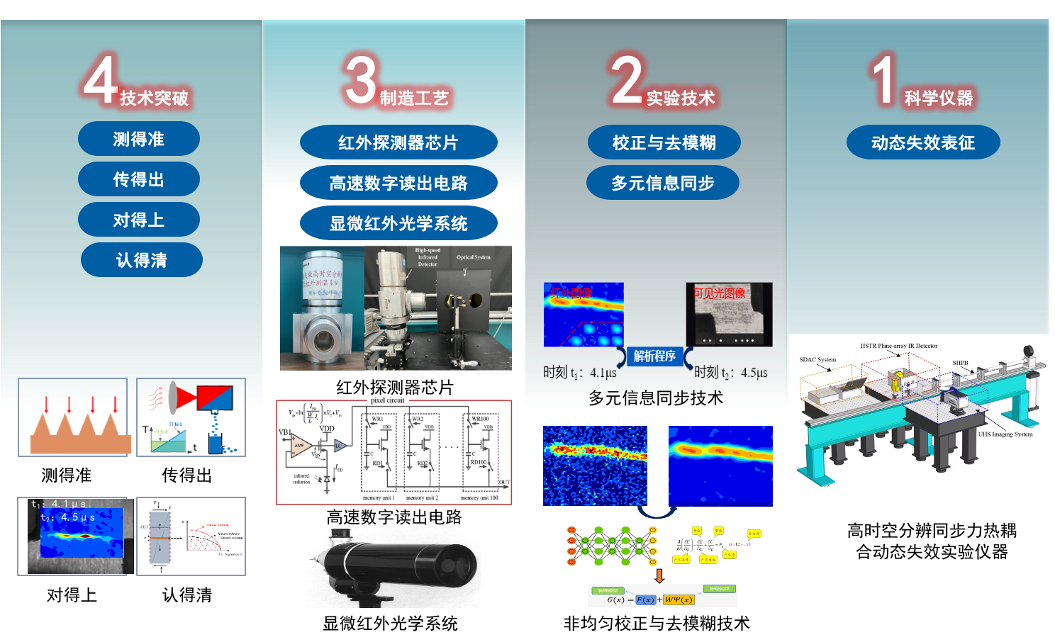 自主研制的全国产64×64面阵式红外探测器,实现1MHz采样频率下连续存储100帧图像,配合2×光学系统实现25μm空间分辨率和25~800℃测温范围,各项指标均领先于现有报道的同类仪器;结合购置的高速光学仪器(7M),率先搭建了微秒量级高时空分辨同步动态加载、变形场与温度场测量系统,可满足动态断裂、动态摩擦、地震力学、机械高速加工、炸药安定分析等领域的科学研究与测量需求。