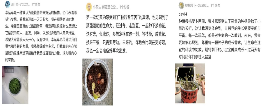 在活动中,同学们积极上传植物生长的照片,展示每日精心养护的成果。这些照片不仅记录了植物的变化,也让人感受到校园生活的多彩和温暖。令人感动的是大家用文字记录了细心陪伴植物成长的心得体会,或是表达对生命顽强生长的感叹,或是抒发对绿色生活理念的感悟,更有同学从本次活动中有了对生活和学习新的理解。
