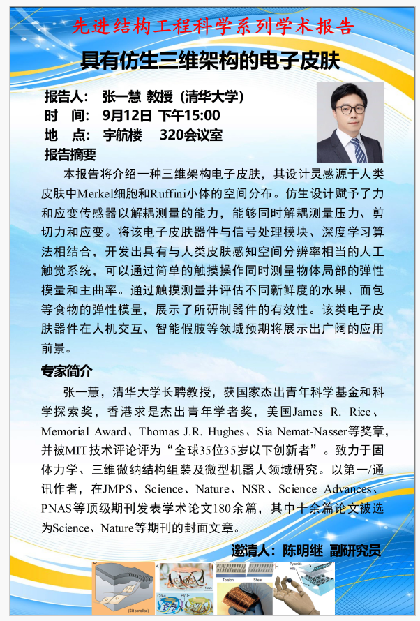 清华大学张一慧教授作题为“具有仿生三维架构的电子皮肤”的学术报告预告