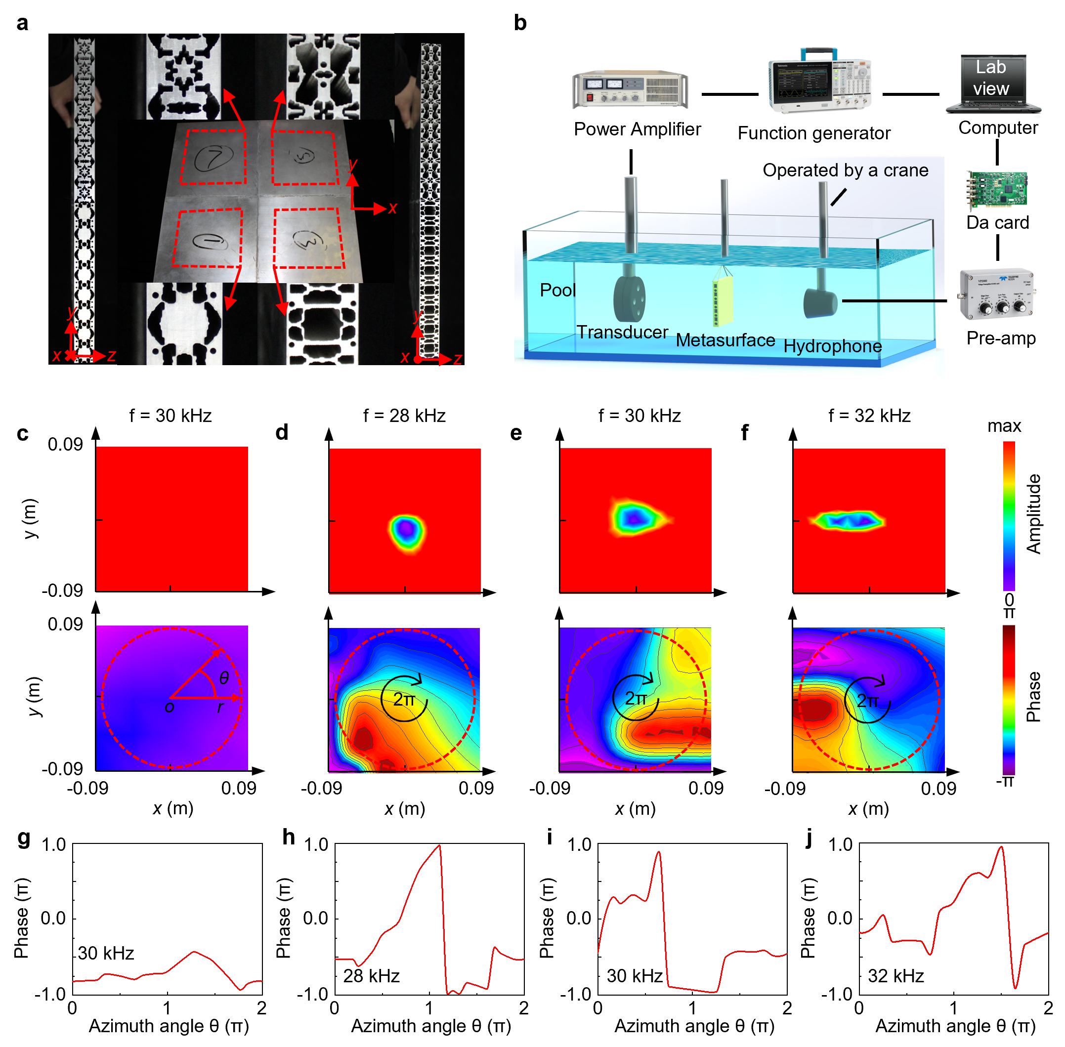 (a)超结构样件。(b) 水声测量系统示意图。(c) 未部署超结构的自由场在30 kHz时的振幅和相位分布。(d-f) 逆向设计超结构在28 kHz、30 kHz和32 kHz下测量的振幅和相位分布。(g) 图3c中虚线位置的相位值随方位角的变化,其中θ为极坐标的方位角。(h-j) 图3d-3f中虚线位置的相位值随方位角的变化。