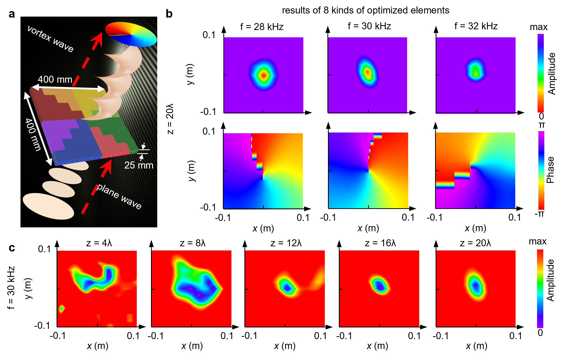 (a) 基于8种基元结构的示意图。(b)距离超结构20λ处涡旋波振幅和相位的分布。(c) 在30 kHz时声压场在五个横截面上的振幅分布。