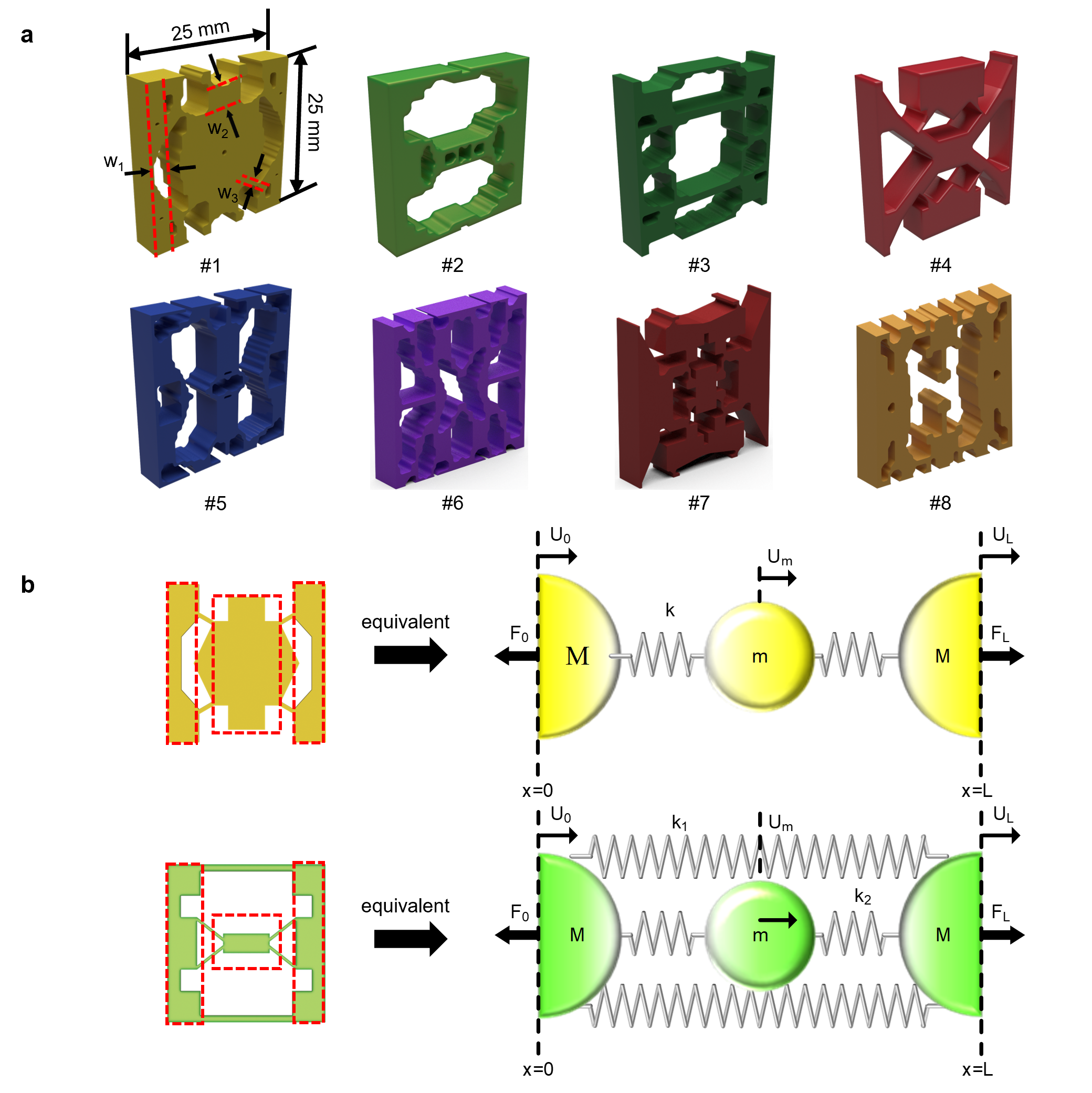 (a) 八种基元结构。(b) 简化后的基元结构与等效弹簧质量模型。
