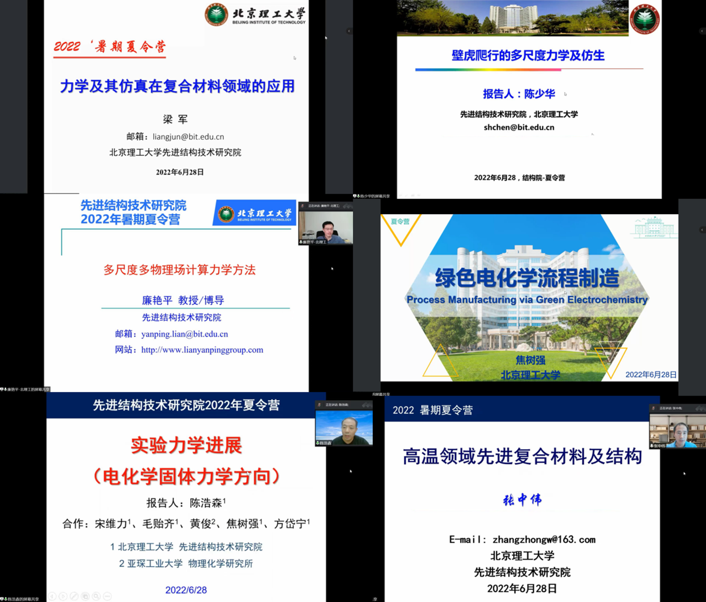 梁军、陈少华、焦树强、廉艳平、陈浩森、张中伟六位教授,以学生兴趣为出发点,融合实际应用与专业基础,分别从力学及其仿真在复合材料领域的应用、壁虎爬行的多尺度力学与仿生、绿色电化学流程制造、多尺度多物理场计算力学方法、实验固体力学进展、高温领域先进复合材料及结构等方向全方位展示了我院的学科特点及研究领域,使得营员们对未来的科研发展有了更为明确的目标。讲座结束后,雷红帅和曹志强两位老师以云直播的形式带领营员们参观了良乡实验室,深入介绍了我院的实验设备与科研平台。